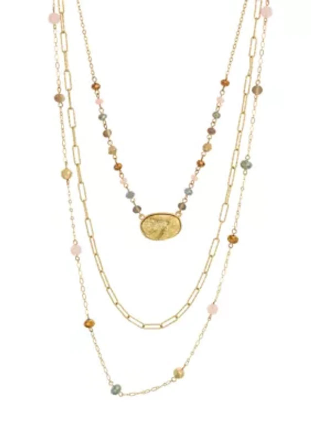 Gold Tone Pink and Blue Multi Bead Station Layered 3 Row Short Necklace with Oval Druzy Drop