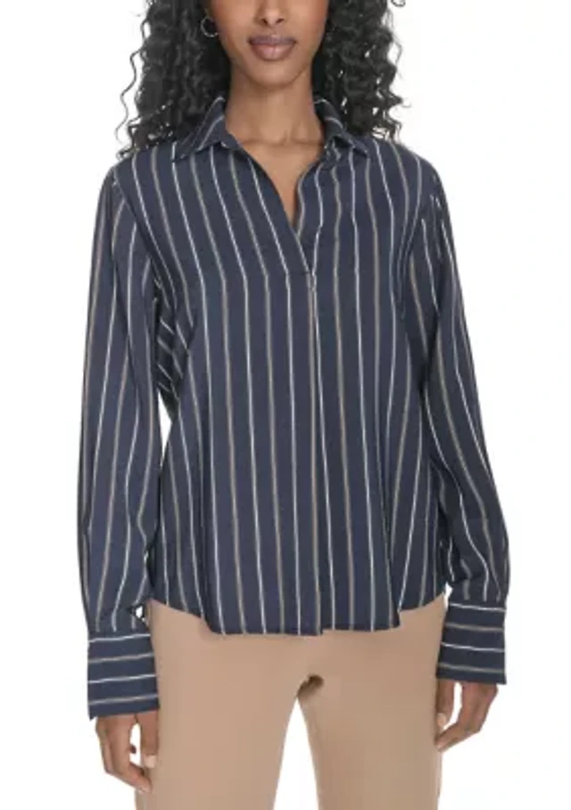 Ann Taylor Striped Ruffle Collar Shirt Ivory Women's