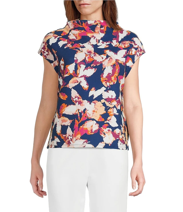 Investments Petite Size Knit Blue Autumn Floral Short Sleeve High Neck Ottoman Top