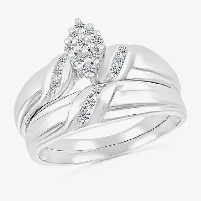 1/8 CT. T.W. Diamond Square Cluster Wedding Ensemble in Sterling Silver - Size 7 and 10.5