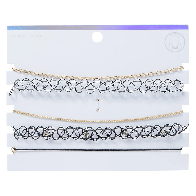 Gold Chain & Black Tattoo Choker Necklaces Set, 5-Piece
