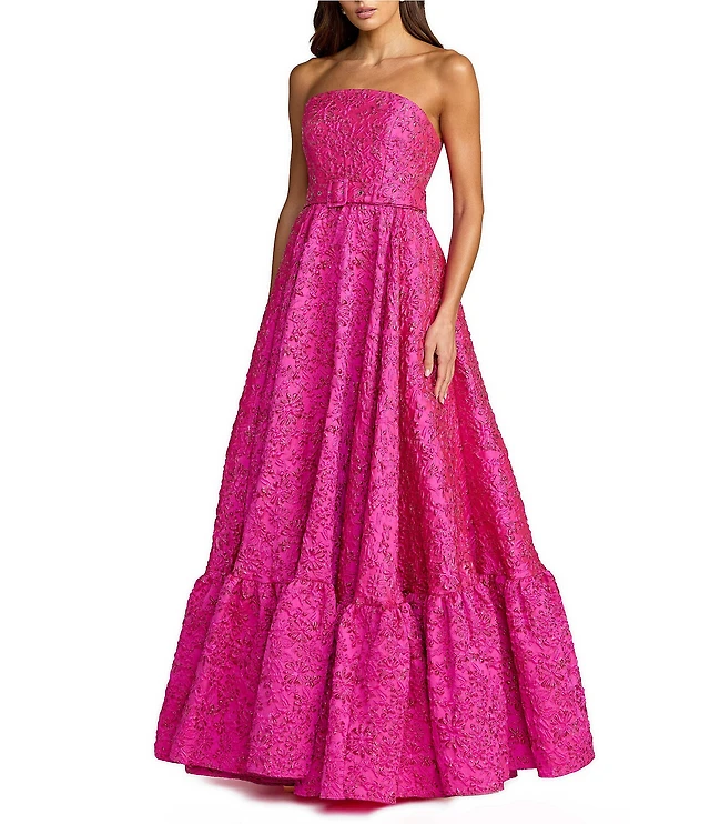 Mac Duggal Strapless Floral Jacquard Belted Ruffle Hem Gown