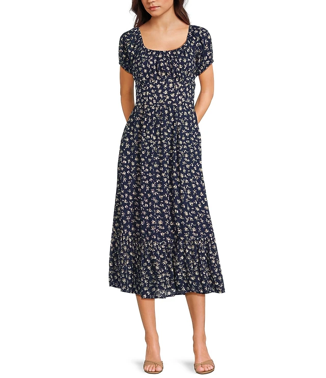 DKNY by Donna Karan Floral Print Charmeuse Ruffle Cap Sleeve Asymmetrical Flutter Hem Faux Wrap Midi Dress