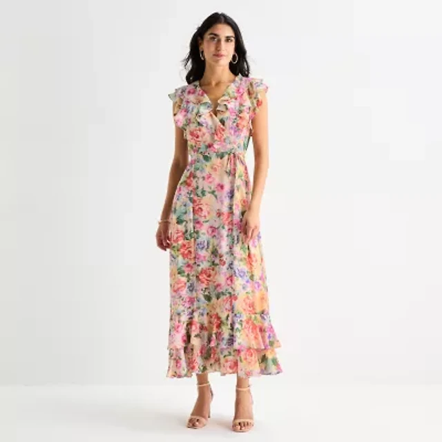 B. Darlin Floral Printed Sweetheart Neck Tie Shoulder Tiered Midi Dress