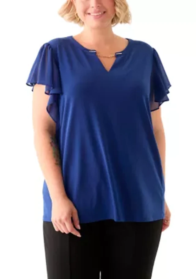 Petite Blouson Sleeve Mesh Mock Neck Printed Blouse
