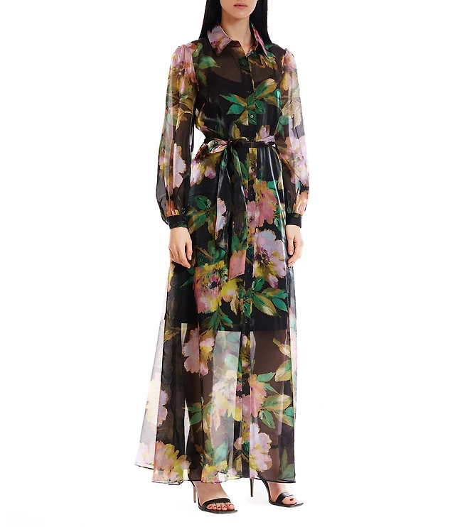 Julia Jordan Organza Collar Neckline Long Sleeve Floral Belted Maxi Shirt Dress
