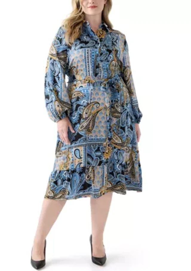 Plus Long Sleeve Shirt Dress with Small Tiered Printed Flat Satin Self Back-Facing