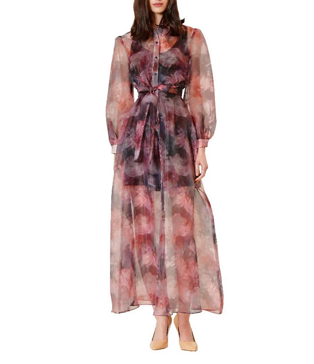 Julia Jordan Printed Organza Collar Neckline Self Tie Belt Long Sleeve Sheer Shirt Dress