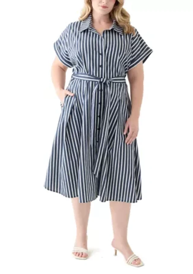 Plus Short Sleeve Yarn Dyed Belted Shirtdress
