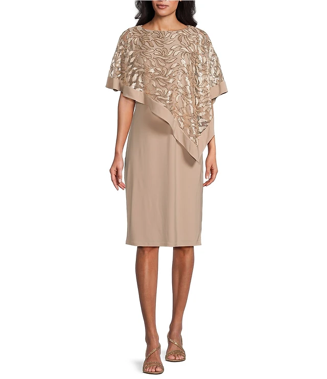 R & M Richards Petite Size Crew Neck Short Sleeve Embroidered Sequin Poncho Overlay Sheath Dress
