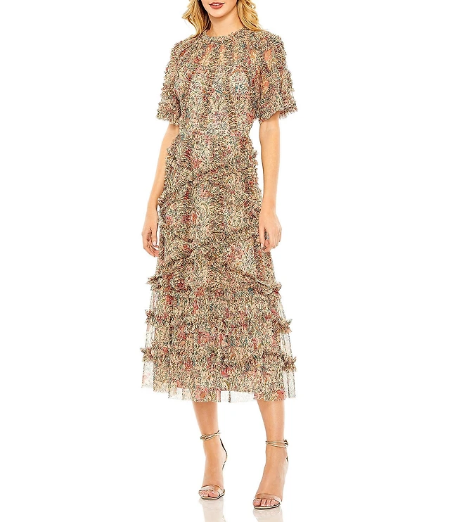 Adrianna Papell Chiffon Floral Print V-Neck Short Flutter Sleeve A-Line Midi Dress