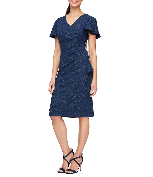 Kensie Ruched Waist Faux Wrap Surplice V-Neck Short Flutter Sleeve Midi Dress