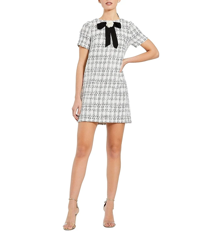Mac Duggal Boucle Tweed Short Sleeve A-Line Midi Dress