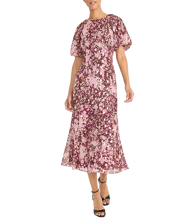 Anne Klein Animal Print Crew Neck Short Puff Sleeve Smocked Printed Chiffon Maxi Dress