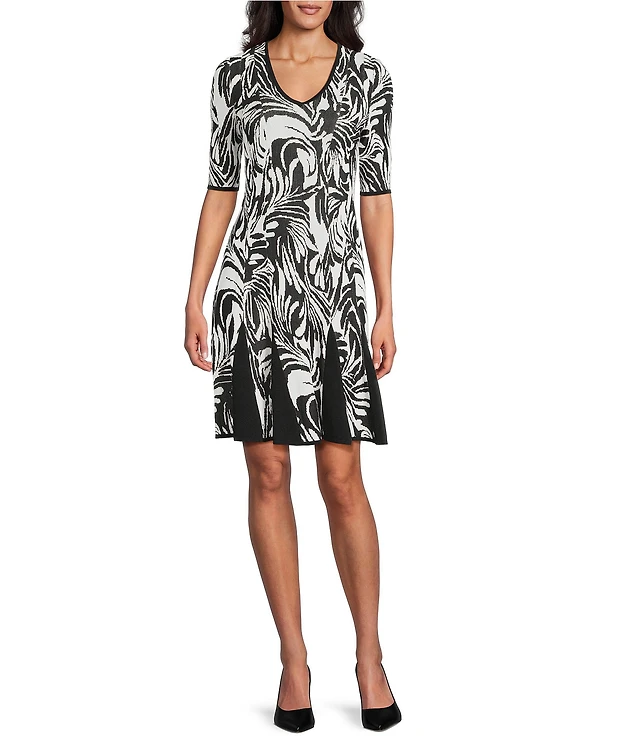 Ming Wang Floral Colorblock Knit Round Neck Short Sleeve Fit-And-Flare Midi Dress