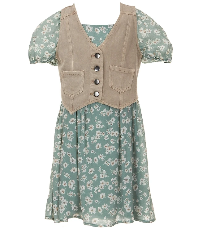 I.N. Girl Big Girls Western Vest & Short Sleeve Floral Print Fit & Flare Dress Set