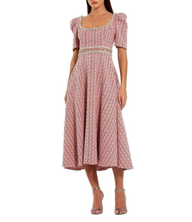 Mac Duggal Puff Sleeve Tweed Midi Dress With Beaded Belt