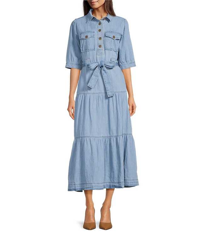 Marella Fagotto Denim Point Collar Short Sleeve Midi Dress