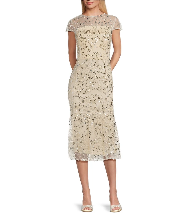 Mac Duggal Beaded Chiffon Short Sleeve Boat Neck Sheath Midi Dress