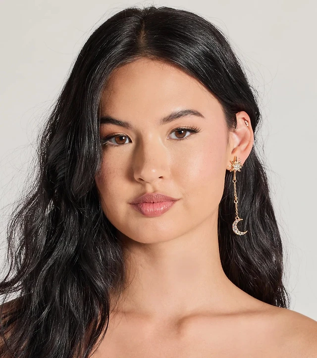 Cubic Zirconia Crescent Moon and North Star Drop Earrings in Sterling Silver