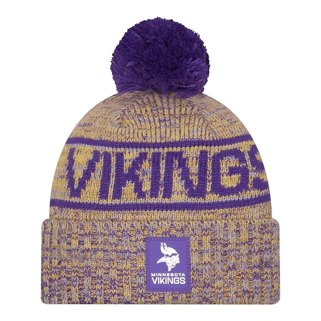 Minnesota Vikings Yellow and Purple 2025 Sideline Cold Weather New Era Cuffed Beanie Knit Hat with Pom