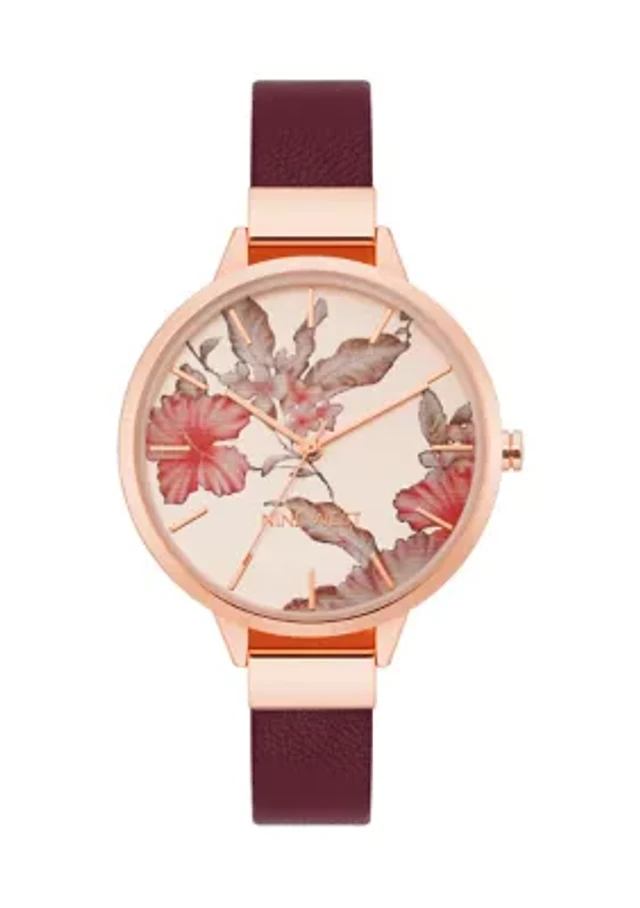 Women's Quartz Round Rose Gold-Tone Metal Burgundy Faux Leather Watch