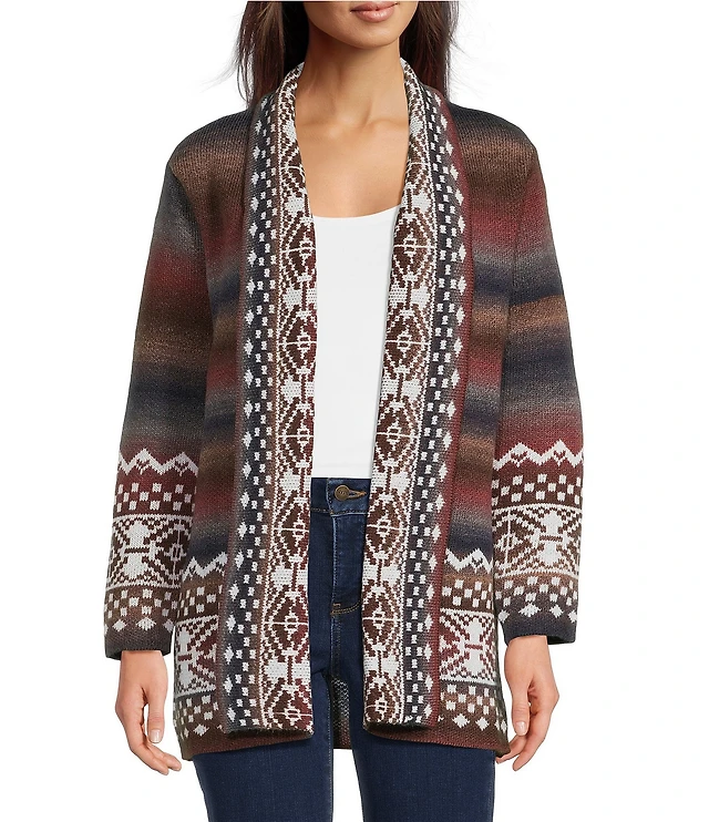 Ali Miles Petite Size Abstract Border Print 3/4 Sleeve Open-Front Cardigan