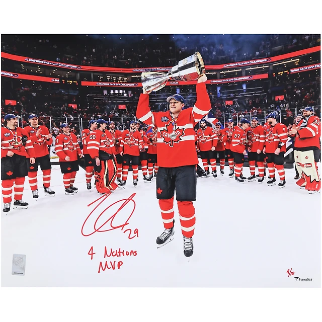 Nathan MacKinnon Canada Autographed 16" x 20" 4 Nations Face-Off Champions Celebration Photograph with "4 Nations MVP" Inscription - Signed in Red Ink
