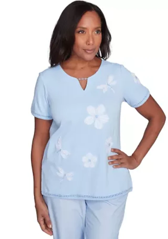 Petite St. Thomas Dragonfly Floral Asymmetric Embroidery Top