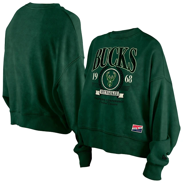 Women's New Era Hunter Green Milwaukee Bucks Throwback Vintage Enzyme Wash Oversized Boxy Pullover Sweatshirt