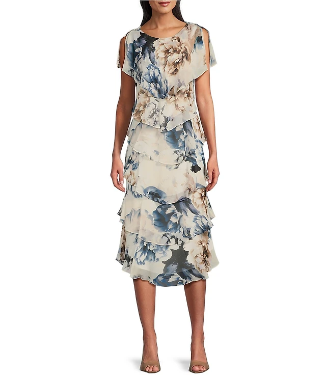 Calessa Petite Size Vine Floral Split V-Neck Short Puff Sleeve Tiered A-Line Midi Dress