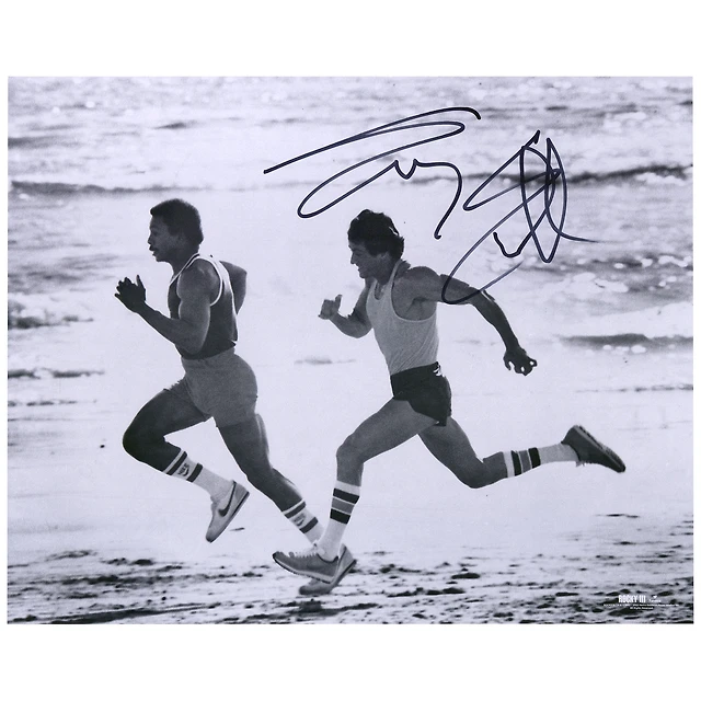 Sylvester Stallone Rocky III Autographed 16'' x 20'' Running with Apollo on the Beach Photograph