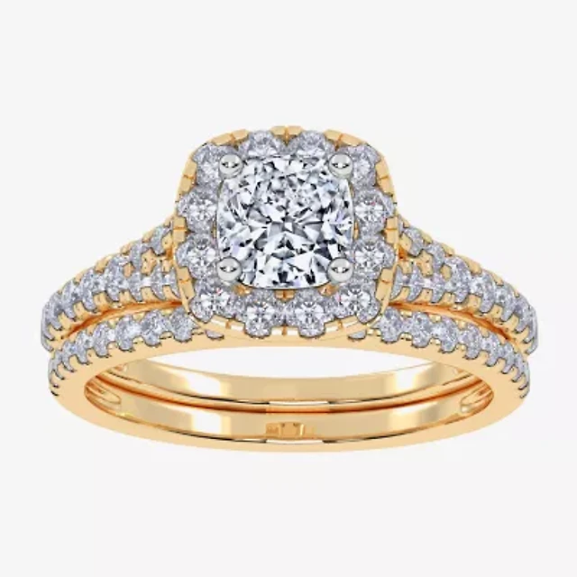 H-I / Si1-Si2) Womens / CT. T.W. Lab Grown White Diamond 10K Gold Cushion Side Stone Halo Bridal Set