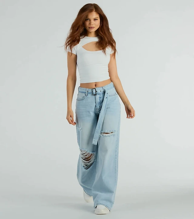 Cool Vibes High-Rise Belted Destructed Wide-Leg Jeans
