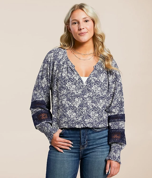 Petite Floral Lace Trim Yoke Blouse