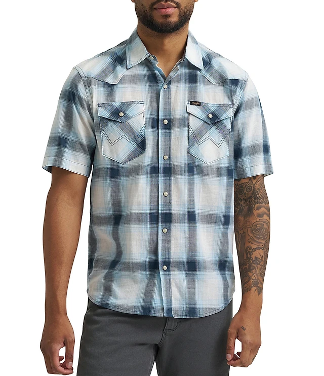 Wrangler® Retro Plaid Short Sleeve Sawtooth Pocket Western Snap Shirt
