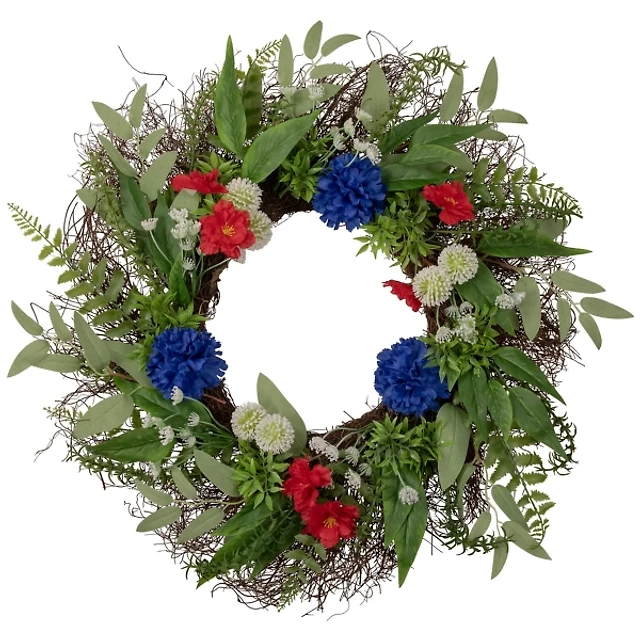 Red and Blue Mixed Floral and Foliage Wreath