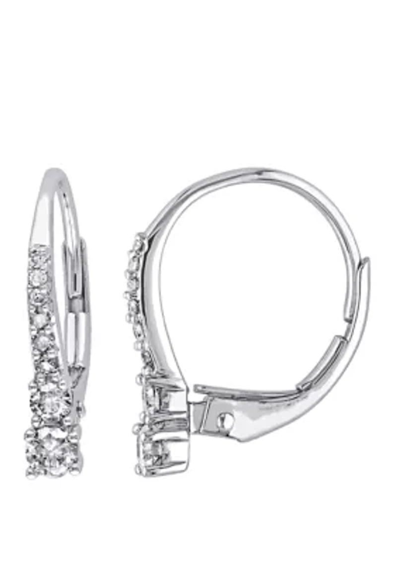 These dazzling Belk & Co. diamond earrings will lend an eye-catching touch of sparkle to your look. Crafted in lustrous 10k White Gold, these earrings feature 16 round-cut, prong-set 1/3 ct. t.w. Diamonds. Enhanced with a high polish finish, these earrings make a wonderful gift either for yourself or someone you love. 16 Diamonds Color rating: G, H Clarity rating: I2-I3 Lever back closure Prong setting Polished finish 1-year warranty Imported Belk Exclusive Product Specifications 1/3 ct. t.w. Diamonds 15.7 mm H x 3 mm W Material & Care 10k White Gold Clean with a soft cloth