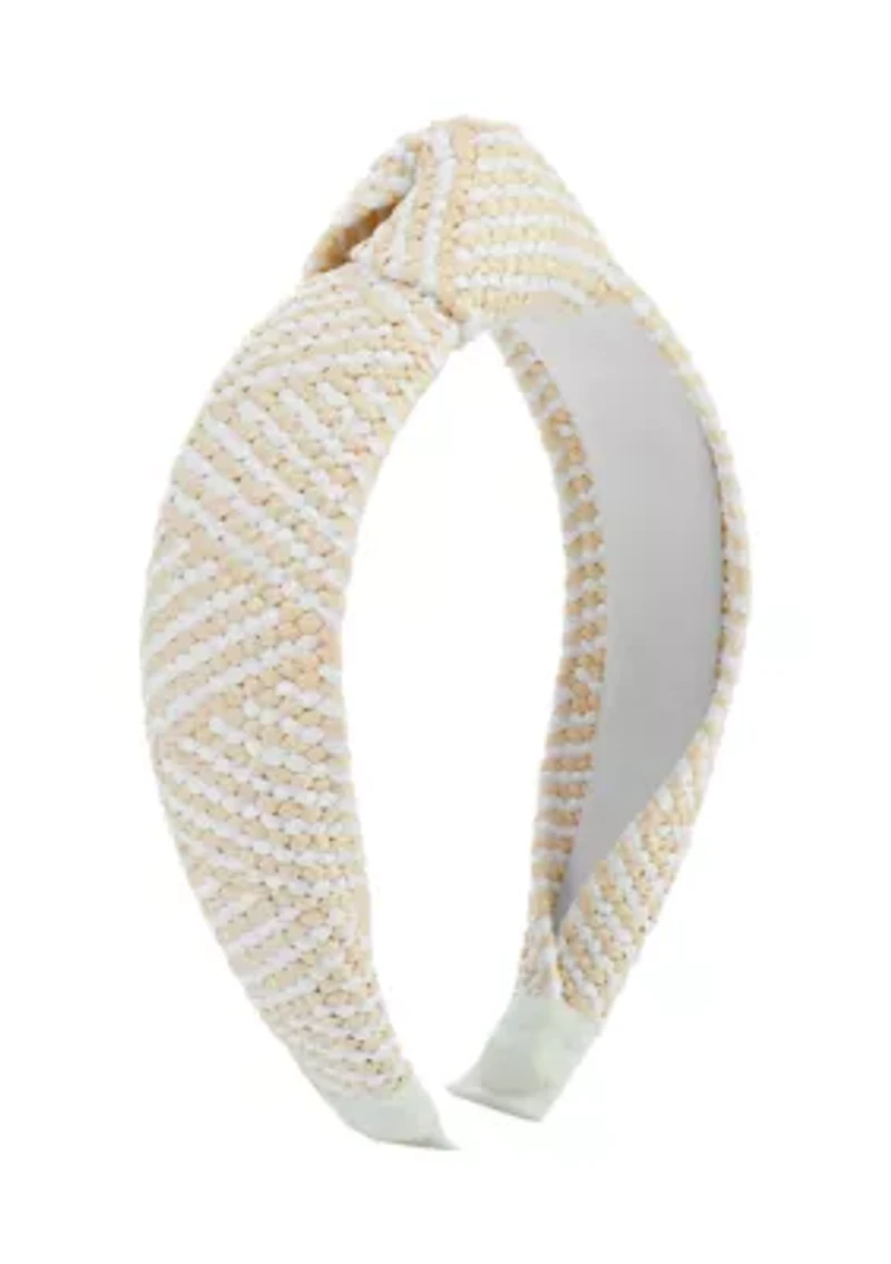 A top knot and woven beige & white exterior add chic dimension to this evie & emma headband. Imported Belk Exclusive Product Specifications 4" x 6" x 1" Material & Care Polyester Spot clean only
