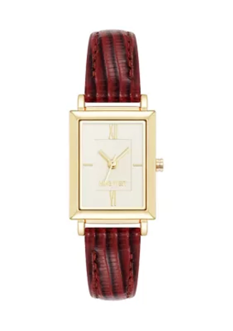 This rectangular watch from Nine West is a sophisticated statement piece. With architecture-inspired details, this minimalist watch features a red polyurethane faux leather band and gold-tone case. Buckle closure Analog dial Japanese quartz movement Polished finish Limited liability warranty 11 years Imported Product Specifications 101mm x 101mm x 76mm 22mm case size Material & Care Gold tone metal, polyurethane Clean with a soft cloth