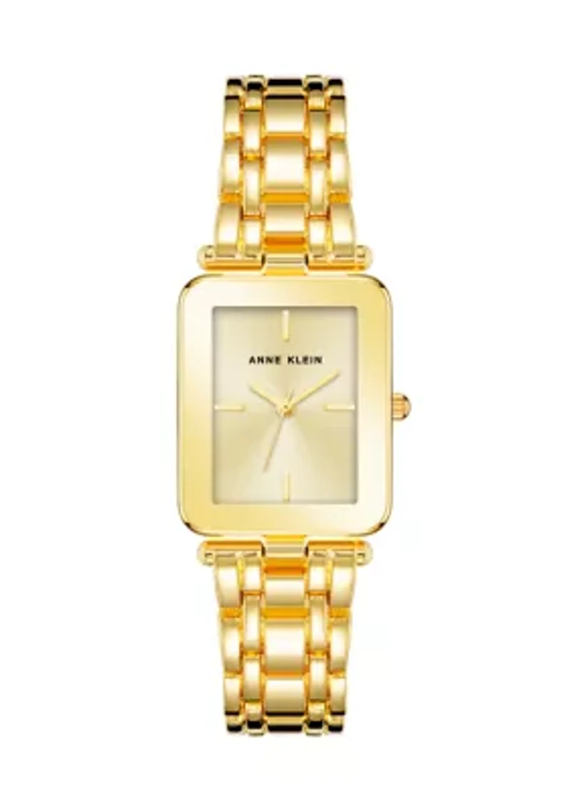 This sophisticated watch from Anne Klein is a wardrobe staple. With its classic design and rectangular case, it adds a touch of luxury to any everyday outfit. Foldover clasp Analog dial Japanese quartz movement Polished finish Limited liability warranty 11 years Imported Product Specifications 101mm x 101mm x 76mm 22.3mm case size Material & Care Gold tone metal Wipe clean