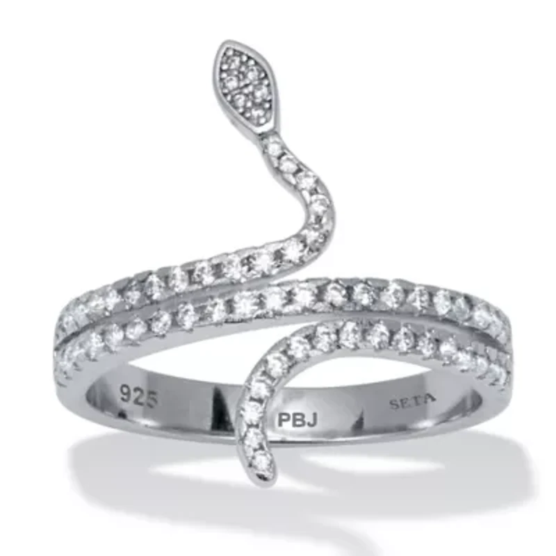 Embrace a lighthearted elegance with our playfully designed snake ring. Embellished with 0.40 TCW of radiant micropave cubic zirconia stones, this whimsical sterling silver serpent is thoughtfully crafted to spark conversations and make a statement. Sizes 6-10.Embrace a lighthearted elegance with our playfully designed snake ring. Embellished with 0.40 TCW of radiant micropave cubic zirconia stones, this whimsical sterling silver serpent is thoughtfully crafted to spark conversations and make a statement. Sizes 6-10.Sterling SilverContains 2.90 grams of Sterling SilverShank Width: 2.7 mm wideSterling SilverContains 2.90 grams of Sterling SilverShank Width: 2.7 mm wideDimensions: 22.5 mm wide x 22.5 mm long x 2.5 mm highIncludes gift box and drawstring pouch 60 Polished finish Warranty available China Imported Product Specifications 0.98 in x 0.89 in x 0.89 in Material & Care Metal, Sterling silver Clean with a soft cloth.