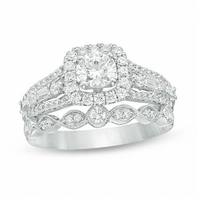 1-1/2 CT. T.w. Diamond Cushion Frame Vintage-Style Bridal Set in 14K White Gold
