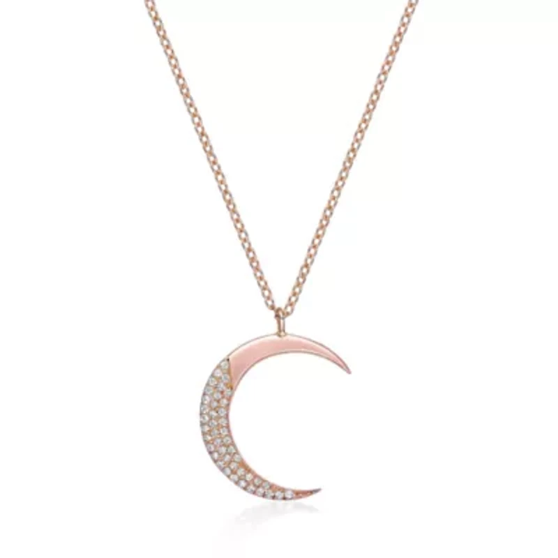 Accented with sparkling round diamond details totaling 0.16 ct. t.w., this crescent moon pendant adds celestial elegance and subtle shimmer to any look. The diamonds highlight the graceful curve of the moon design with radiant brilliance. Suspended from an 18-inch chain with a secure clasp, this enchanting pendant is perfect for everyday wear or as a meaningful, star-inspired gift. Spring ring clasp, 43 Color rating: I, H Clarity rating: I2-I3 Polished finish Prong setting India Imported Product Specifications 18 IN x 20MM x 15MM 0.16 Material & Care Metal, Gold plated Use silver polishing cloth on silver items.
