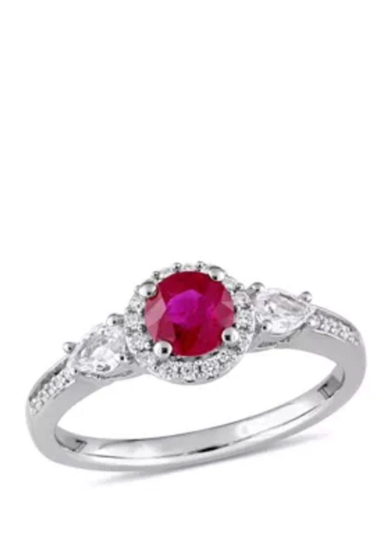 1.0 c.t t.w. Ruby, White Sapphire and 1/8 ct. Diamond Halo 3 Stone Ring 14k Gold