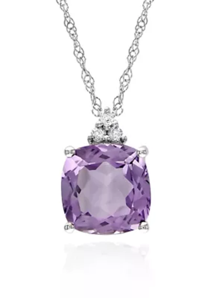 This 10k white gold pendant features 1.75 ct. t.w. amethyst with 0.03 ct. t.w. diamond accent and measures 11.50mm in length and 8.00mm in width on a 17-in. rope chain, secured with a spring ring clasp. Almost all gemstones have been treated to enhance their beauty and require special care. Prong and Shared Setting 1 Amethyst and 3 Diamonds Imported