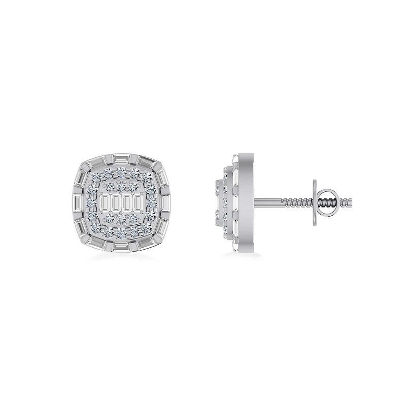 10K White Gold Round Baguette Diamond Square Designer Earring /4 Cttw