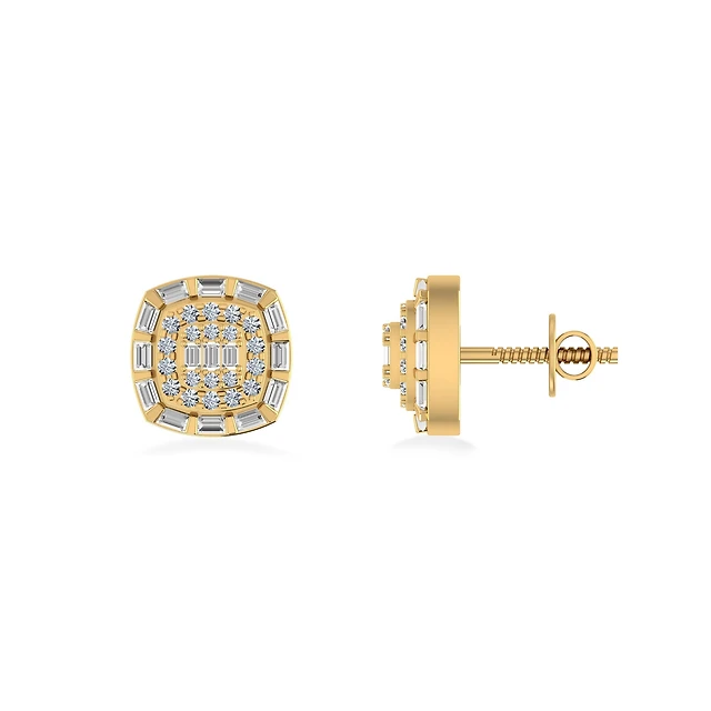 10K Gold Round Baguette Diamond Square Shape Designer Mens Stud Earring / Cttw