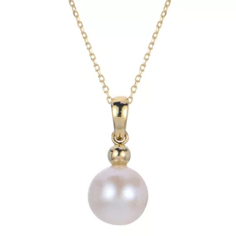 A lustrous white 8-8.5mm off-round shape cultured freshwater pearl topped with a polished 10k yellow gold bead and bale, come together to create this understated yet sophisticated pendant that is a classic addition to any jewelry collection. Lobster closure Polished finish Imported Product Specifications 0.0000 Material & Care Metal, Gold Clean with a soft cloth.