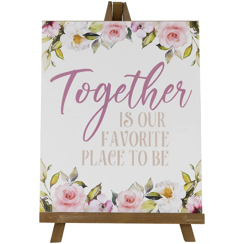 Add warmth and charm to your living space with this wooden tabletop sign. Embracing the sentiment that "Together is Our Favorite Place To Be " this piece features a beautiful Spring floral design that enhances any room's décor. Celebrate togetherness and create a cozy atmosphere with this heartfelt decorative accent.Details:White with multicolor accents11" x 7.5" x 0.5"Opened easel frame: 6.5"